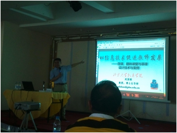 北大的赵国栋教授主讲题目为“微课、翻转课堂与慕课设计技术与案例”,他首先概述了三者的概念及相互关系,接着又详细讲解了微课演化的四段论模型,并展示了各种类型的经典微课。最后,赵教授重点向与会的各位老师重点推广了“四课一体式”的教学设计模型及其技术解决方案--基于模板的快课技术。并展示了目前国外比较流行的微课制作过程中应具备的硬件设备及软件类型,之后又向大家展示了各个软件的操作及其效果,给大家留下了深刻的印象。