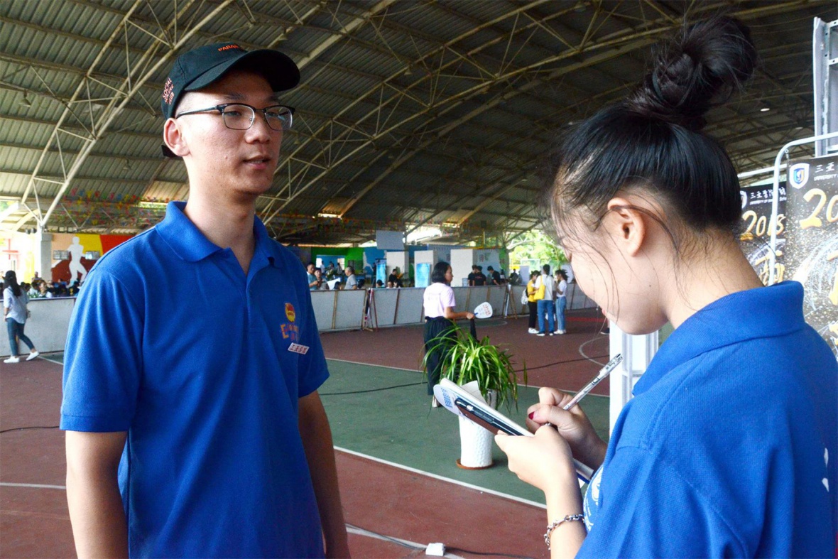 为了更好的开展工作,各组织负责人也亲临现场,与干事一起准备迎新。这其中,就有员工会的张群伟。当谈及迎新所带来的感触时,张同学谈到自11号起,员工会便开始做迎新准备,带干事熟悉工作流程和了解工作性质,尽量保证为期3天的迎新活动尽善尽美。