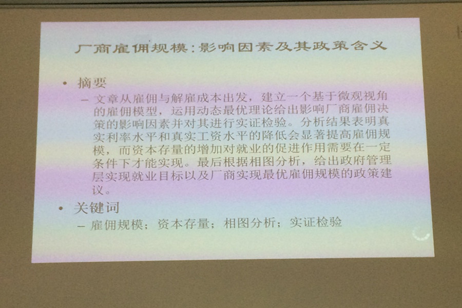 王涛老师首先向大家介绍了本次学术报告所涉及的研究灵感来源:从马克思到新古典经济学派,学者们在其著作或文献中对厂商雇佣规模的影响因素给出了不同的解释,但却忽视了雇佣和解聘过程中发生的成本对雇佣规模的影响。因此,王涛院助提出自己研究的切入点:从雇佣与解雇成本出发,建立一个基于微观视角的雇佣模型,找出影响厂商雇佣决策的影响因素并对其进行实证检验。