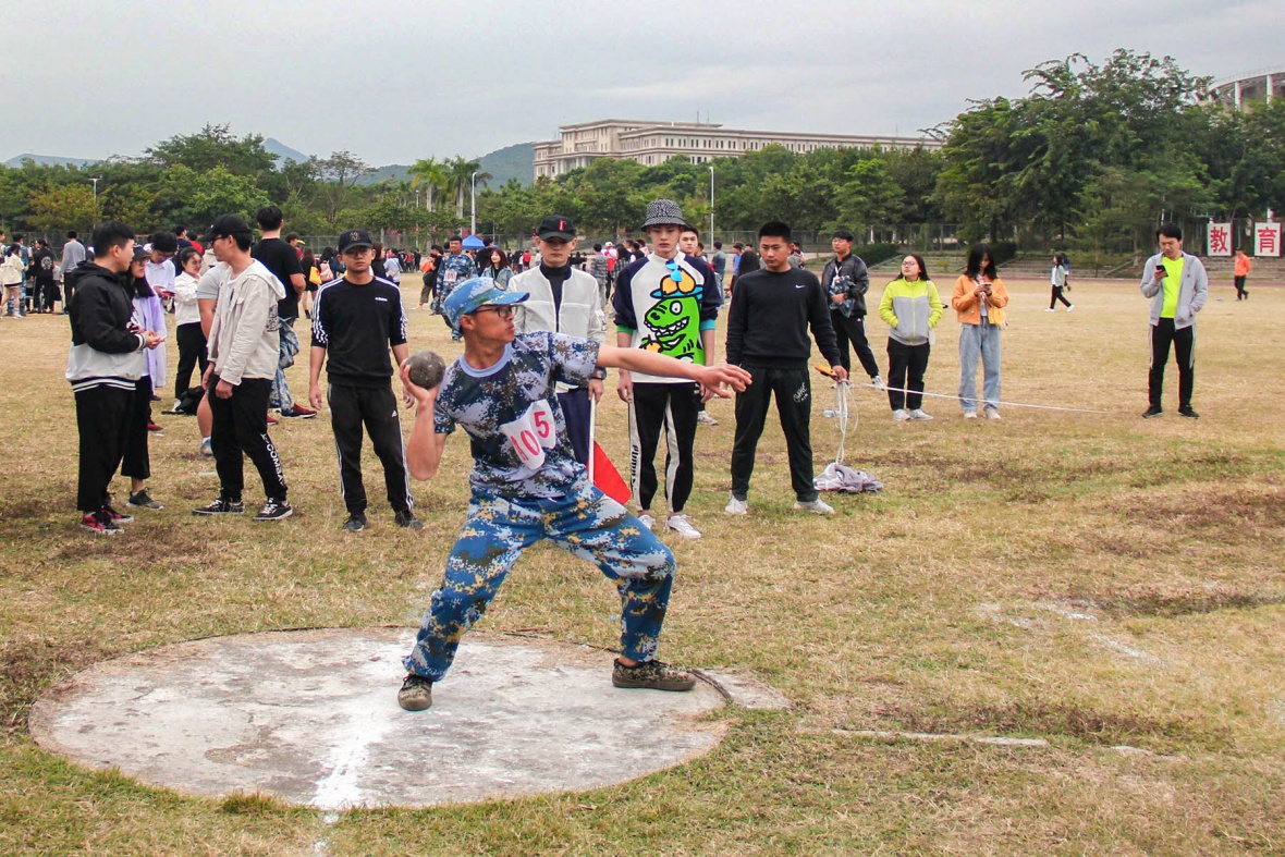 比赛开始前,选手们进行热身,慢跑,俯卧撑,拉腿,想要一展风采。比赛正式开始,唐波同学缓缓举起铅球,扭转身体,下蹲蓄力猛的推出,沉重的铅球在空中划过一道抛物线后落地。最终,经过三轮的角逐,唐波同学以8米34的成绩位列第六名。场边观看的永利集团的同学响起了掌声。