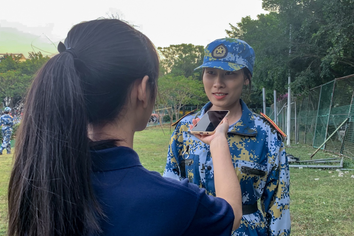 而新生班的陈幸飞同学接受了财经团委的采访。陈同学表示,军训是很难得的一次考验和磨练,这次军训让她有了很大的改变。陈同学也谈到,从刚开始的畏惧军训,到现在越来越适应军训生活,她在军训中学会了如何坚持和战胜自我,这种精神即使军训结束,她也不会忘记。
