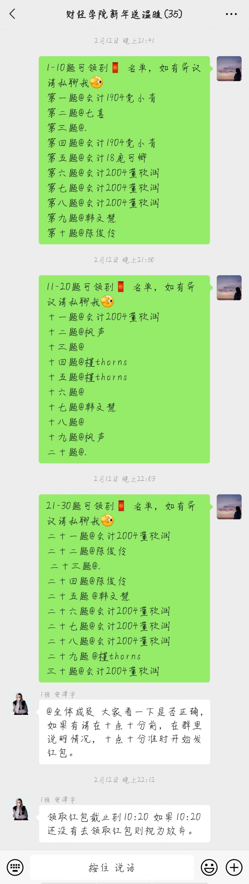 本次的竞赛活动关于文化、科学、娱乐等方面的问题并采取抢答模式,共有三十道题,每道题答题时间为一分钟,在益智添趣,娱乐生活的同时,更以这种传统高雅的文艺形式展现一方水土、民俗之特色与魅力,集趣味性,知识性与一体,让大家学有所乐。最后得分最高的同学还将会获得学院精心准备的一个小红包。21:00整,比赛准时开始,同学们积极抢答,即使是在线上,也能感受到春节喜气洋洋的气氛,主持人还不时地在群里发灯笼小表情与同学们互动,一副其乐融融新年的景象,浓浓的年味在群里流淌着。愉快的时间总是很短暂的,新年知识竞赛很快就结束了,每位参与的同学们都得到了来自永利集团的专属小红包。