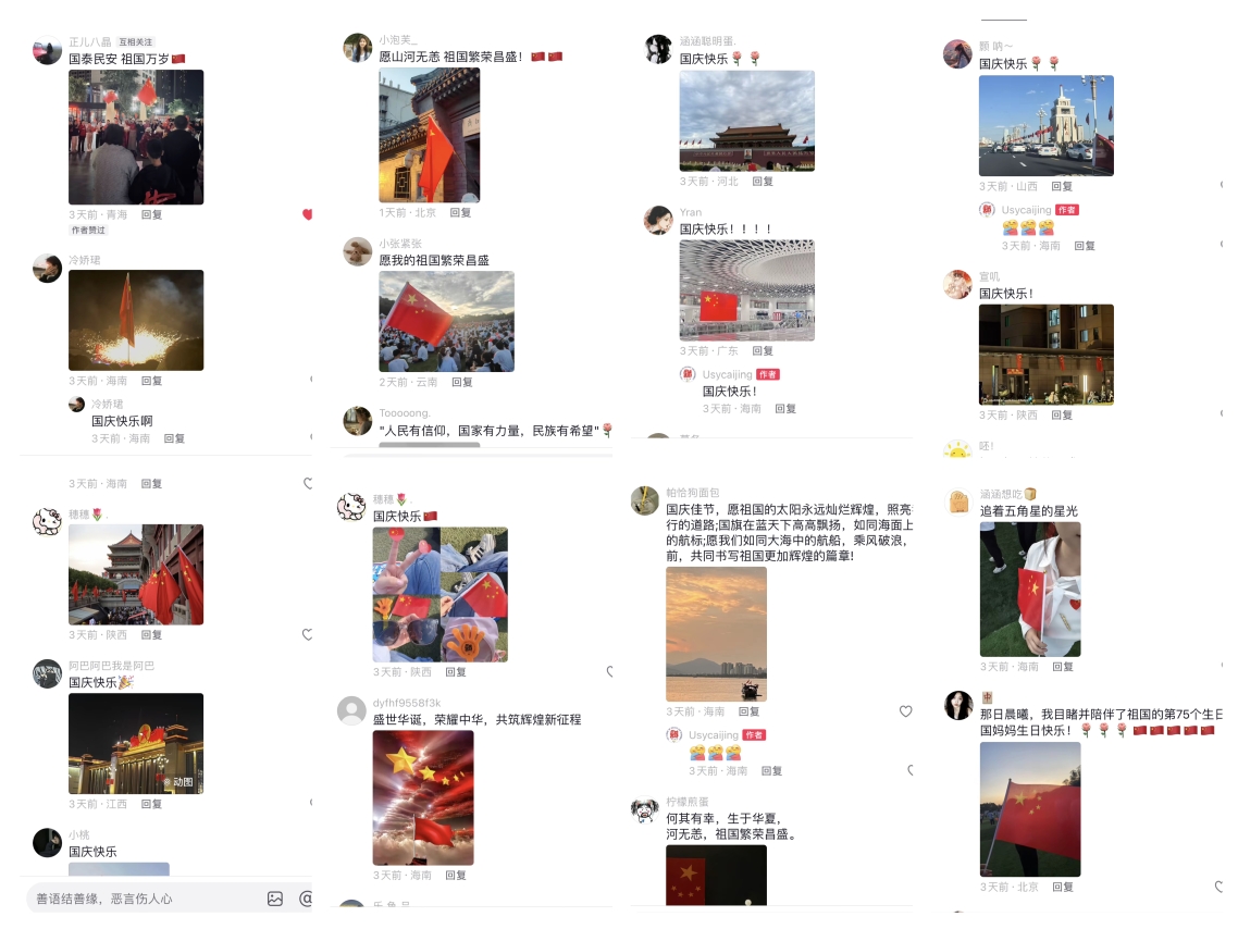 财经学子用优美的语句歌颂着祖国的壮丽山河、悠久历史,表达了对党和祖国的深情挚爱。一张张照片激发了财经学子深厚的爱国情怀,一帧帧画面中民族自豪感油然而生。财经学子在记录国庆瞬间的同时,也深刻体会到了国庆的意义,感受祖国的繁荣昌盛与魅力。