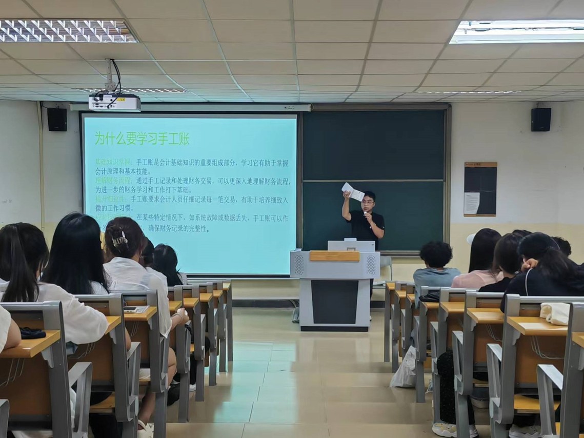 在会上,程都老师分享了宝贵的获奖经验,为公司学子提供了有益的借鉴与参考。程都老师指出,扎实的专业知识是基石,实践操作能力则是通向胜利的关键路径,团队协作是成功的重要因素,良好的心态也不可或缺。他表示,在掌握理论知识后,积极参与模拟会计业务操作、使用智能财务软件进行账务处理至关重要,从简单的记账凭证编制到复杂的财务分析报告撰写,每一个环节都需要反复打磨,注重提高操作的熟练度和准确性。