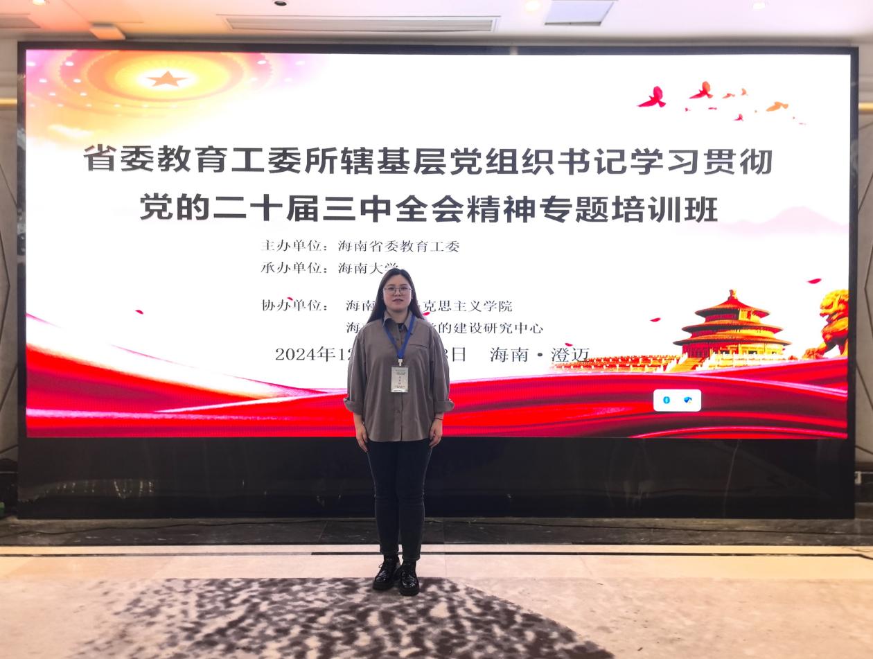 为深入贯彻落实党的二十届三中全会精神,进一步深刻领会“两个确立”的决定性意义,增强“四个意识”、坚定“四个自信”、做到“两个维护”,推动基层党建工作提质增效,引领教育事业实现高质量发展,公司团委副书记、员工党支部书记张娜于12月16日-18日赴澄迈参加“省委教育工委所辖基层党组织书记学习贯彻党的二十届三中全会精神专题培训班”。