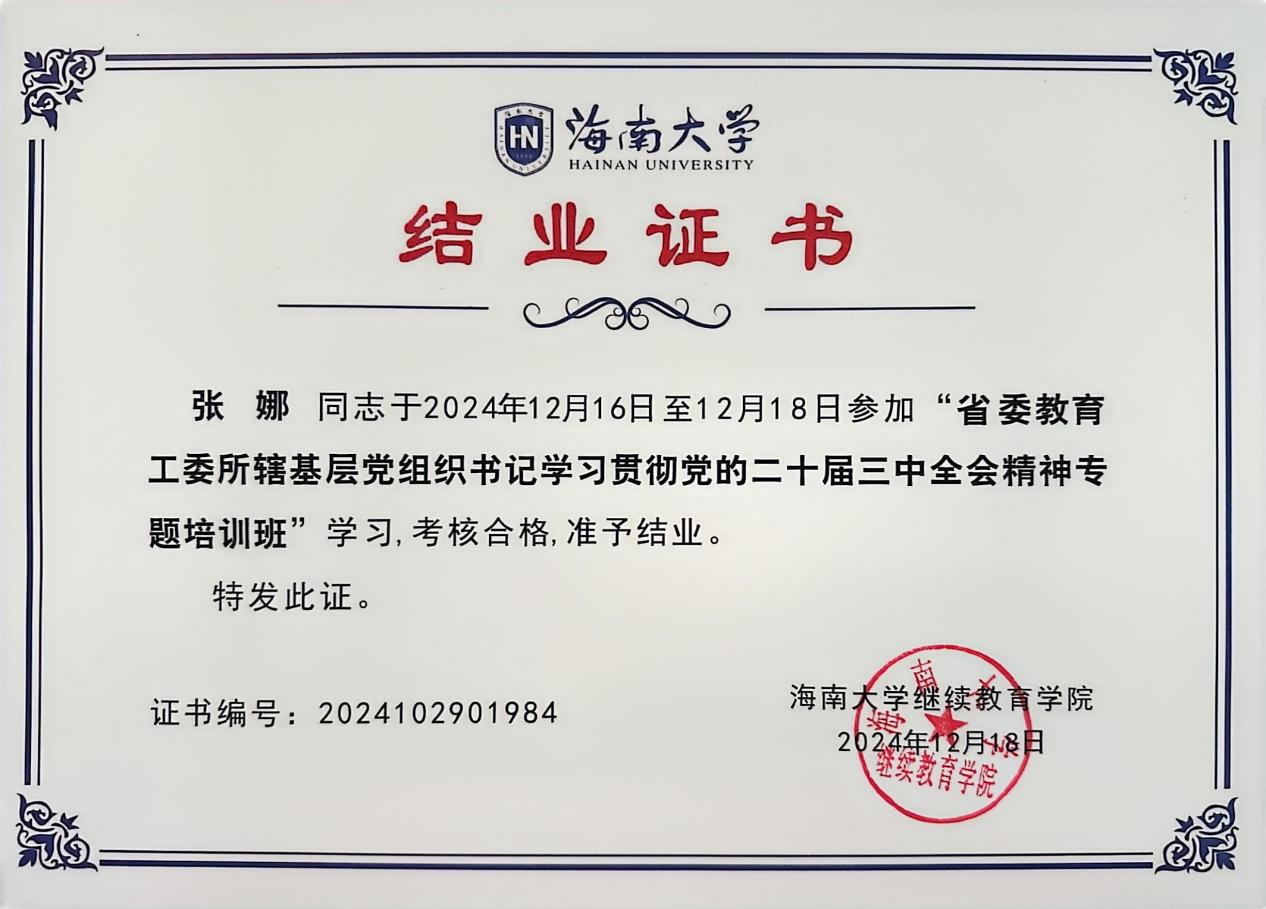 在此次培训过程中,张娜老师与来自全省各地的党务工作者一起深入学习党的理论知识,深刻学习领会党的二十届三中全会精神和中共海南省委八届五次全会精神实质。他们共同探讨了如何将党的教育方针政策更好地贯彻到日常的党组织工作和公司产品工作中,致力于将课程思政融入教学实践,潜心致力于落实立德树人根本任务。通过专题讲座、案例分析、小组讨论等多种形式的学习,张娜老师不仅加深了对党的二十届三中全会精神的理解,还掌握了将理论与实践相结合的有效方法。